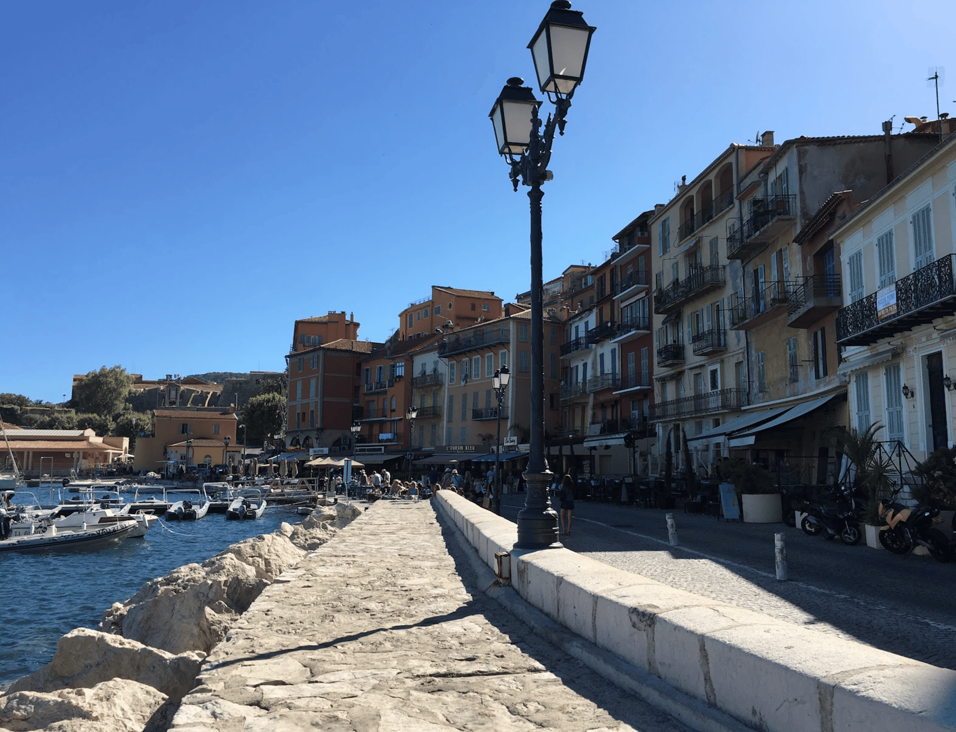 Continuing on strait leads to a narrow passage - through 400-year-old arched tunnels - over the final tier of cobblestone steps, opening up to the waterfront, or “la bord de la mer”. This is where the action is during the day. It’s buzzing with posh seaside bistros and upscale restaurants; and for the younger, sporty crowd of beachgoers - snorkel gear/beach shops, and local hangouts.